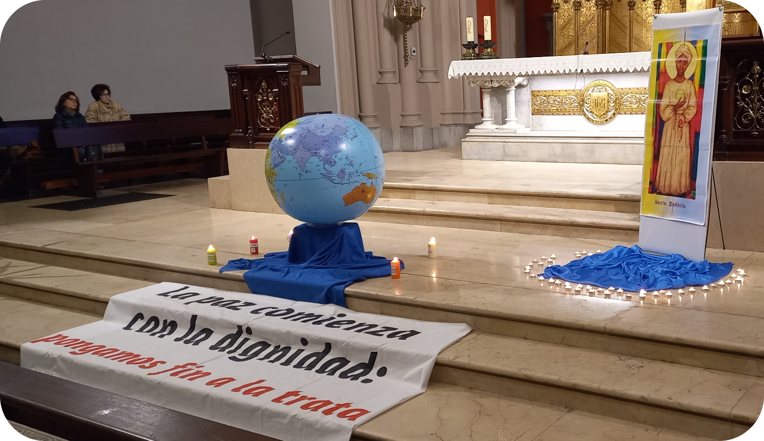 El pasado viernes 6 de febrero se celebró en la Iglesia del Sagrado Corazón de Oviedo una vigilia. Presidida por una imagen de Santa Josefina Bakhita, fue un momento de reflexión y de oración para estar cerca del Cristo que hoy sigue crucificado en tantas personas a lo largo y ancho de todos el mundo. Un sencillo acto en que se fueron encendiendo 5 velas, una por cada continente: